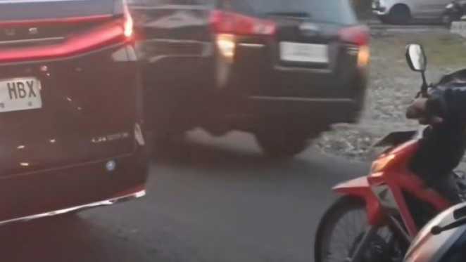 Di tengah antrean, dari sebelah kanan terlihat rombongan pejabat melintas. Mulanya terlihat sebuah mobil patwal polisi melintas. Kemudian terlihat sejumlah mobil pelat merah di belakangnya. Terdengar sirene "tot-tot wuk-wuk" yang dipasang rombongan itu.