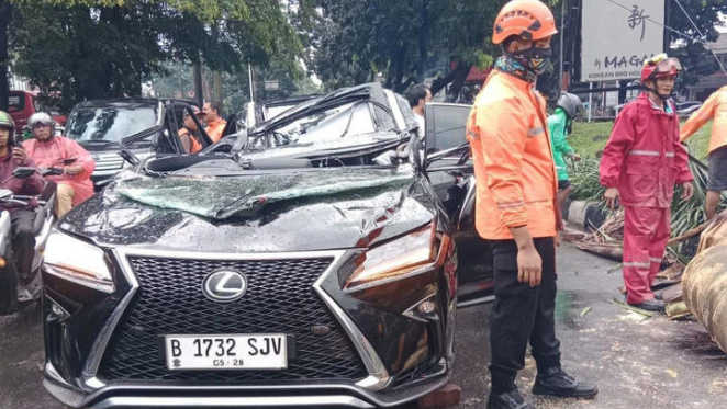 Newscast.id - Hujan deras yang diikuti angin kencang di kawasan Pondok Indah, Jakarta Selatan, pada Minggu, 26 Oktober 2026, menyebabkan pohon bertumbangan. Pohon itu pun ada yang sampai menimpa sebuah mobil Lexus.