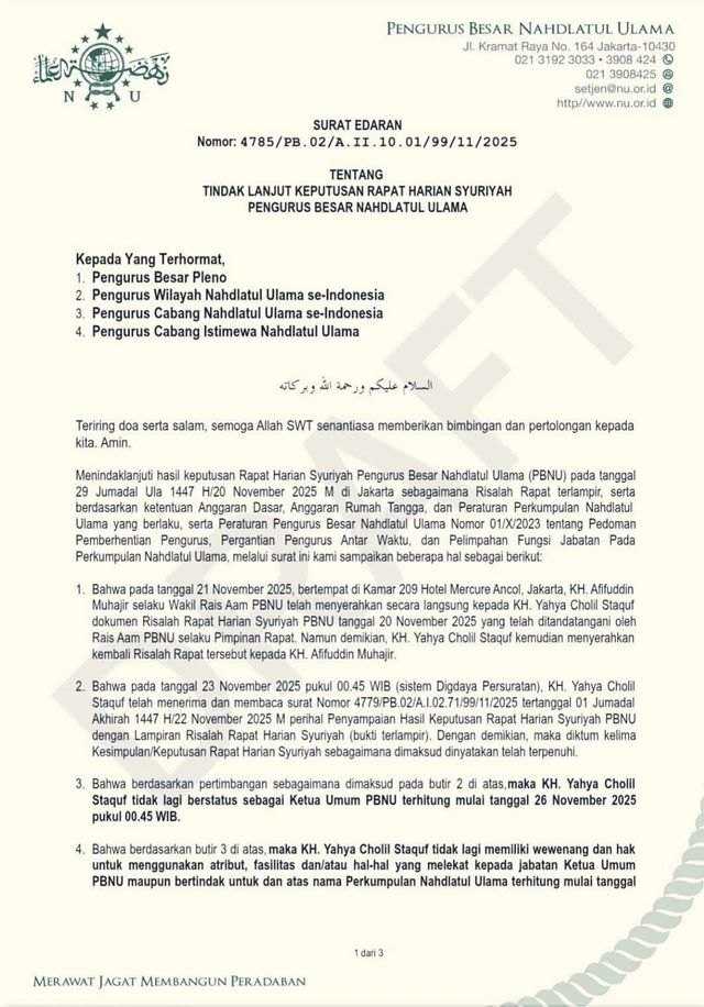 "Dokumen tidak sah, jadi dokumen sah akan diedarkan pada penerima sebagaimana di address surat yang bersangkutan melalui sistem digital. Yang diterima teman-teman itu draf yang tidak sah melalui WA dan lain-lain. Padahal pengurus akan mendapat dari saluran digital milik NU bukan melalui WA, yaitu apa yang kita sebut platform Digdaya," kata Gus Yahya di Kantor PBNU, Jakarta, Rabu, 26 November 2025.