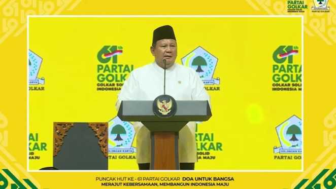 Hal ini disampaikan Prabowo saat memberikan pidato di puncak peringatan hari ulang tahun ke-61 Partai Golkar di Jakarta, Jumat, 5 Desember 2025.