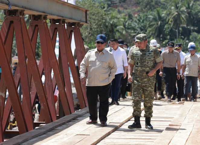Sebelum bermalam di pengungsian, Prabowo menyempatkan diri meninjau jembatan bailey di Sungai Garoga, Tapanuli Selatan.