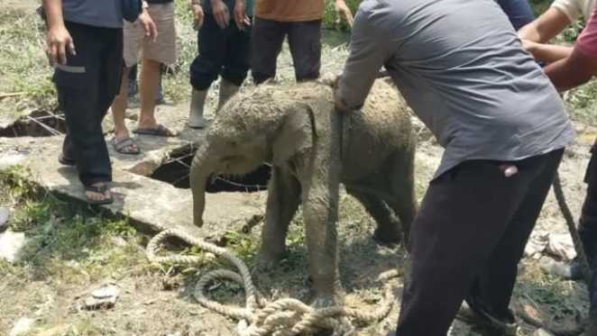 Tim kemudian melakukan pencarian dan menemukan seekor anak gajah terperosok ke dalam septic tank dengan kedalaman sekitar 2 hingga 2,5 meter.