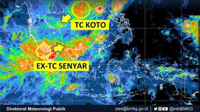 Dari analisis BMKG, saat ini ada dua pemicu cuaca ekstrem di sejumlah wilayah Indonesia beberapa hari terakhir. Pertama, adanya Siklon Tropis Senyar yang terbentuk di Selat Malaka. Kedua, adanya Siklon Tropis Koto.